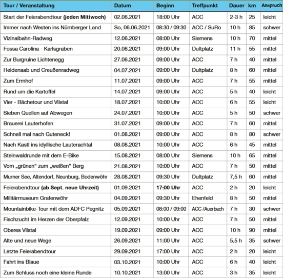 Für diese Touren ist die Teilnehmerzahl strikt begrenzt und eine Anmeldung beim Tourenleiter zwingend erforderlich. Da die Touren auch andere Landkreise betreffen, gelten auch die Bedingungen dort. Es kann es immer noch zu kurzfristigen Änderungen kommen.